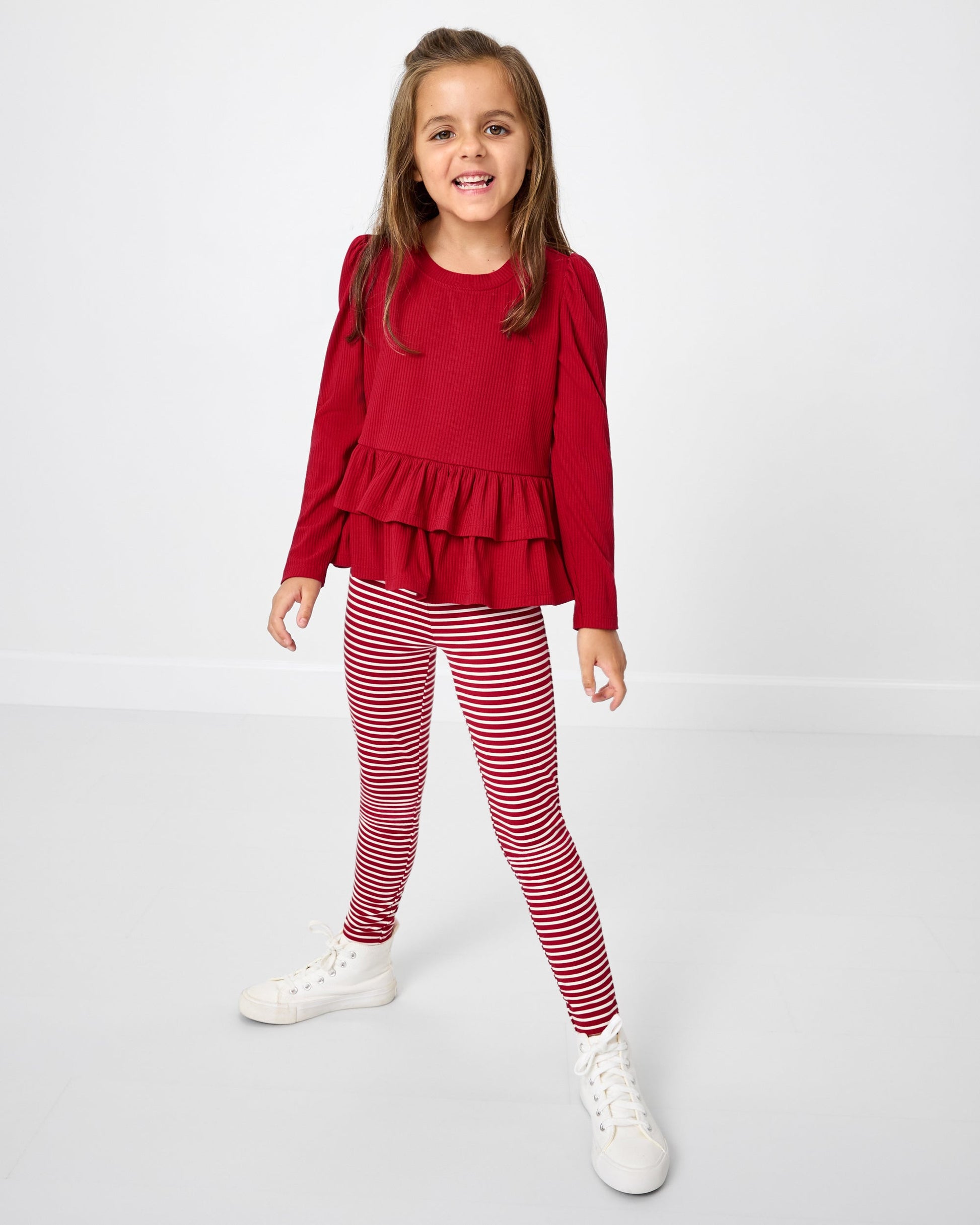 Get cozy for the holidays! The Candy Cane Stripe Legging features classic red and white stripes on durable Soluxe® Bamboo that's gentle on sensitive skin. These kids leggings have a slim fit and easy pull-on style. Perfect for layering under holiday dresses or pairing with their fave festive tops!